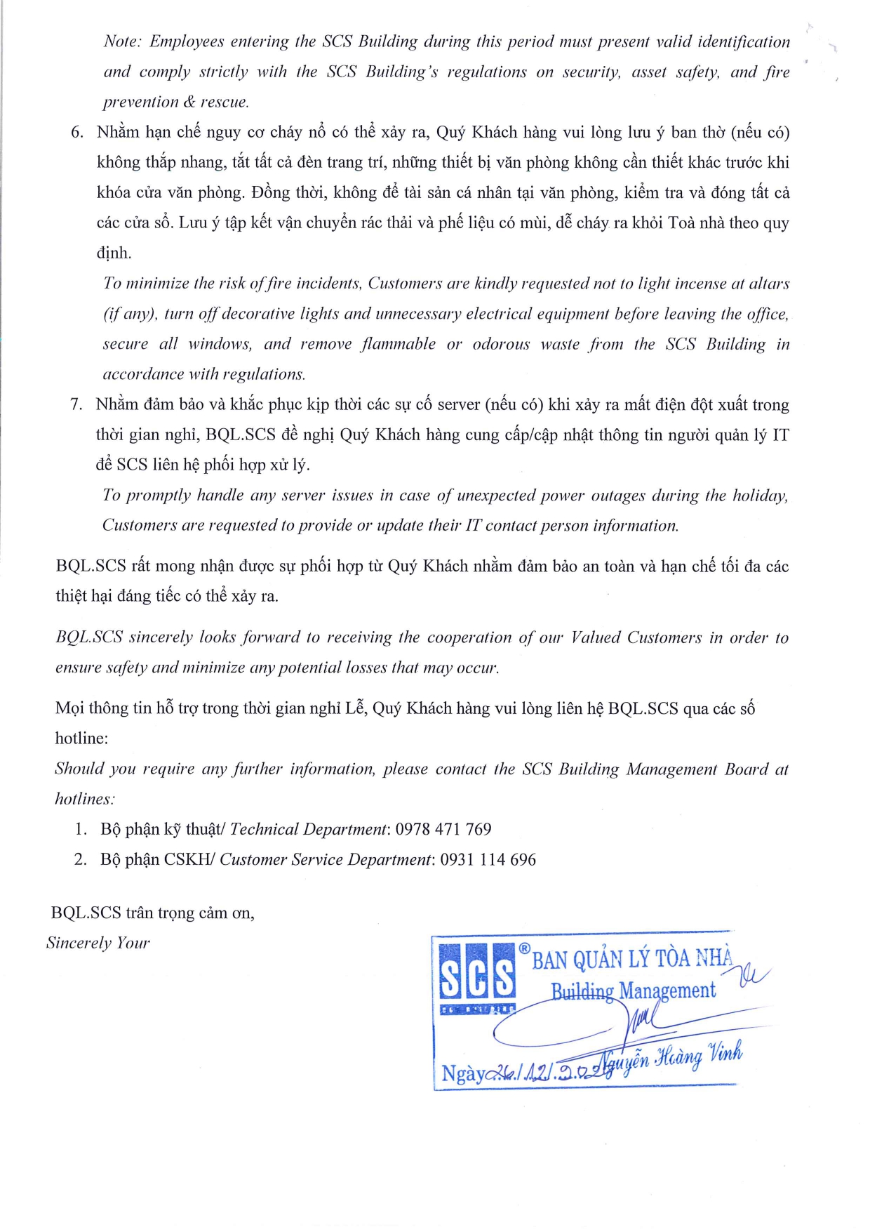 Ngoài ra, nhằm đảm bảo an ninh, an toàn tài sản, an toàn PCCC & CNCH tại Tòa nhà SCS trong thời gian nghỉ Tết Dương lịch năm 2026, BQL.SCS lưu ý đến Quý Khách hàng một số nội dung như thông báo dưới đây.