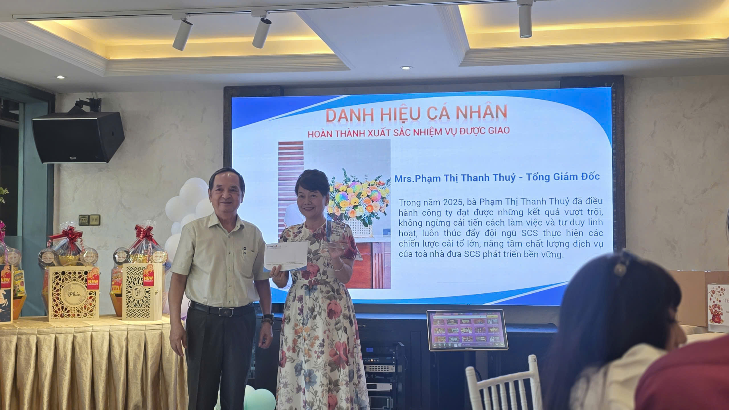 Bà Phạm Thị Thanh Thủy - Tổng Giám đốc Công ty TNHH Sacom - Chíp Sáng trao quà tri ân đến đại diện Quý Khách hàng và Quý Đối tác cung cấp dịch vụ tiện ích đã chung tay giúp môi trường xung quanh tòa nhà SCS thêm xanh, sạch,đẹp