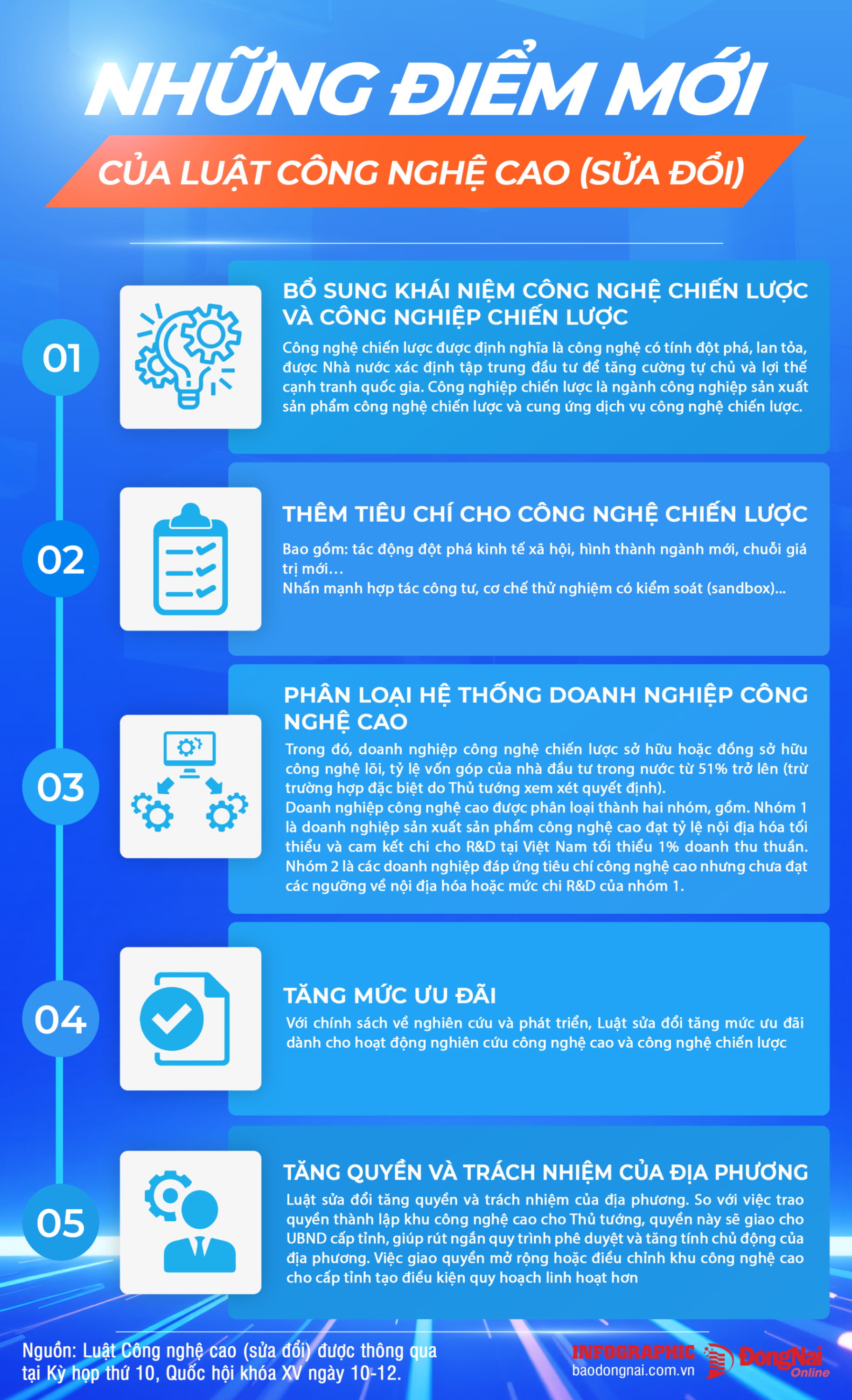 Infographic Những điểm mới của luật Công nghệ cao (sửa đổi) - Nguồn: Báo Đồng Nai (baodongnai.com.vn)