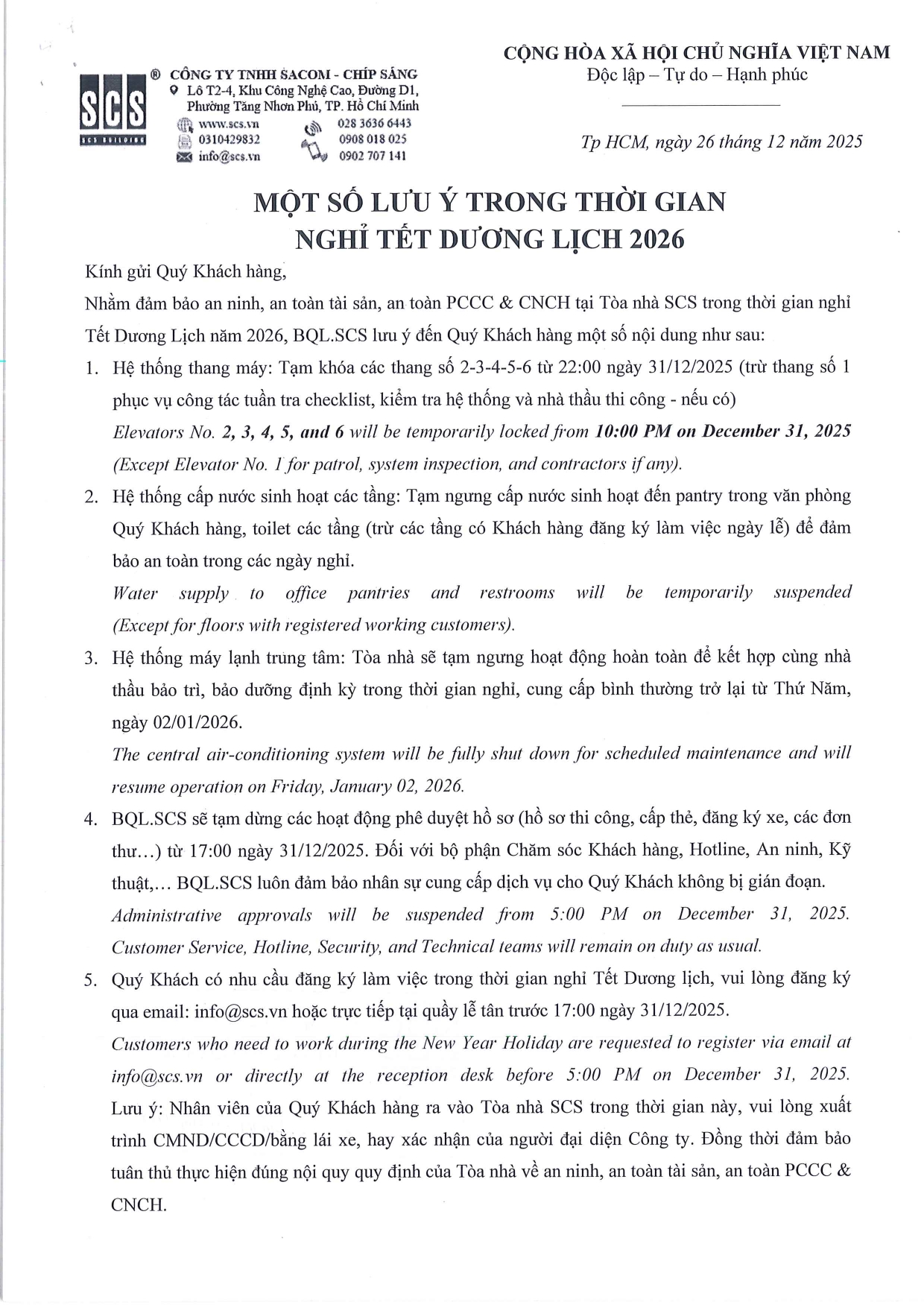 Ngoài ra, nhằm đảm bảo an ninh, an toàn tài sản, an toàn PCCC & CNCH tại Tòa nhà SCS trong thời gian nghỉ Tết Dương lịch năm 2026, BQL.SCS lưu ý đến Quý Khách hàng một số nội dung như thông báo dưới đây.