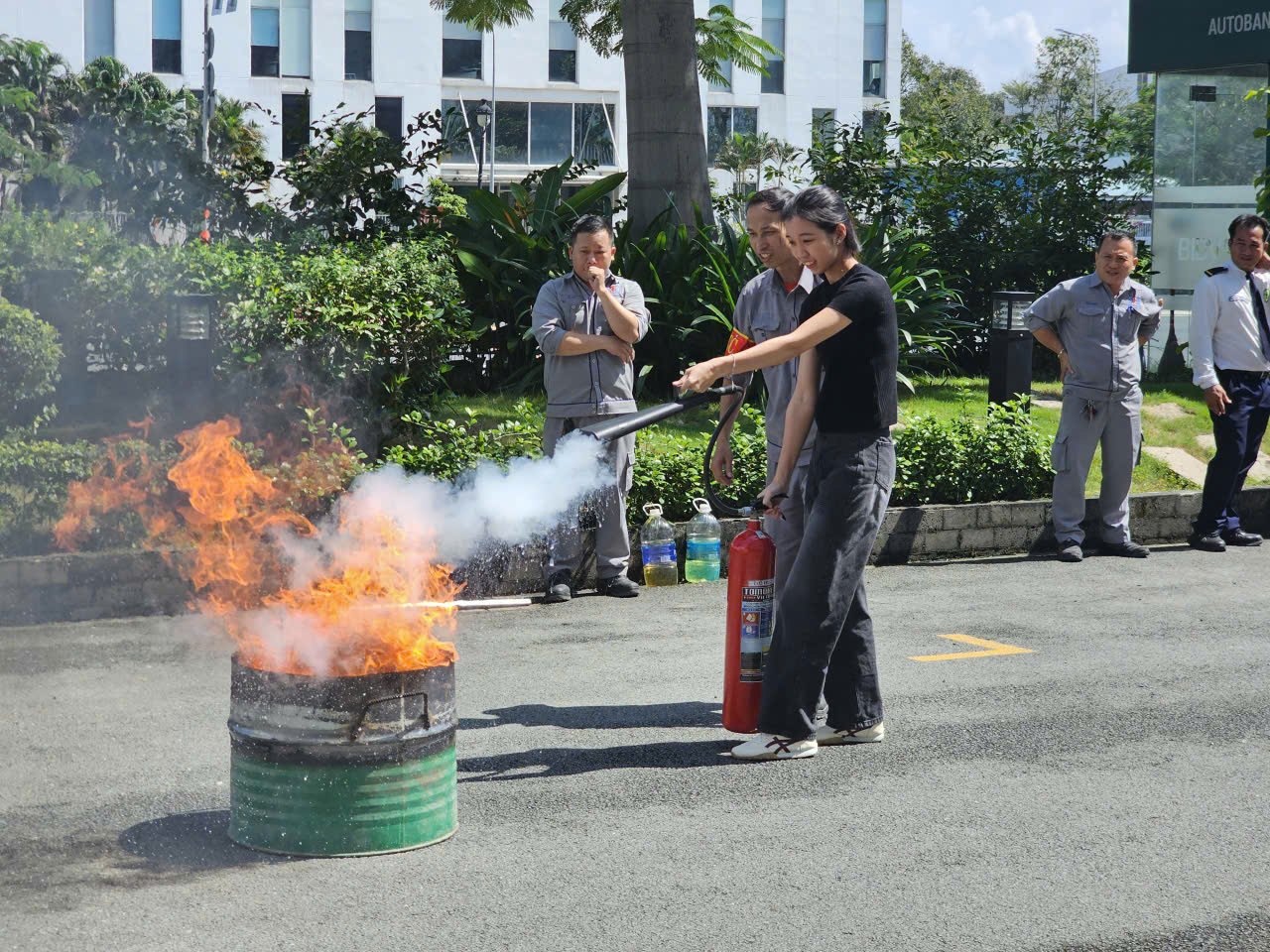 Nhân viên Công ty Cổ phần XNK Phương Phú thực hành thao tác sử dụng bình chữa cháy